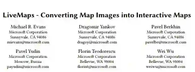 LiveMaps 的处理过程分为几个阶段。它首先检查输入的图像是不是代表一张地图。如果是的话,那么系统将尝试识别该地图所代表的地理区域。在这一过程中,我们使用从图像抽取的文本和视觉信息。最后,我们构建了一个交互式地图对象(interactive map object),它能获取从图像推断出的地理区域。在高级别的定位图像数据集上的评估结果表明我们的系统能构建出非常精确的地图表征,它同样能实现非常好的覆盖范围。