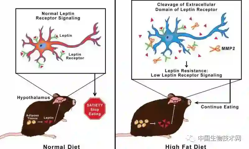 他们发现,喂食高脂肪饮食的小鼠会诱导下丘脑神经元产生更多的基质金属蛋白酶(MMP-2),而这种酶会切割神经元细胞表面的瘦素受体。这会阻止瘦素与受体结合,让神经元无法释放“我已吃饱”的信号,反而一直在喊“饿”。进食的行为无法适时停止,从而导致越吃越多,越吃越胖。