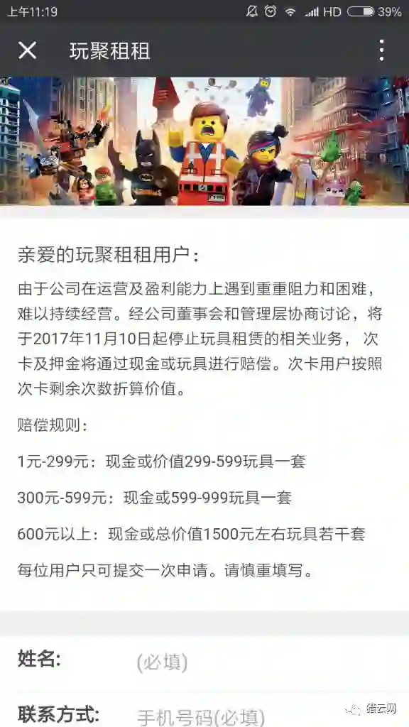 今天上午,猎云网记者收到爆料称:专注乐高租赁的玩聚租租已停止运营。玩聚租租成立于2014年底,是一家玩具租赁平台,并于2016年获得了来自接力基金投资千万级的Pre-A轮融资。