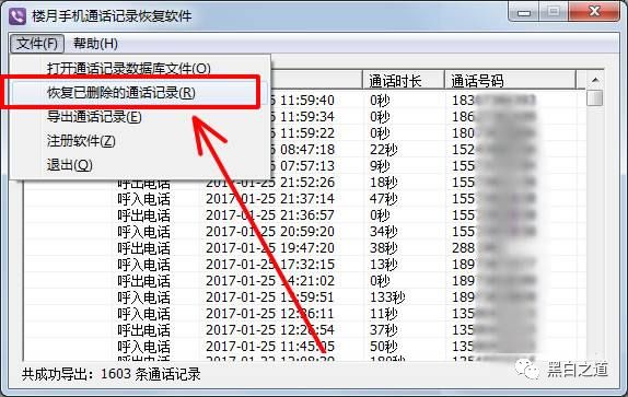 5,再点击“文件”,“恢复已删除的通话记录”菜单。