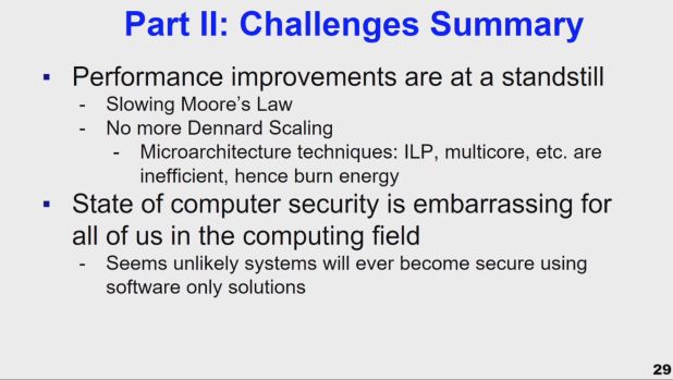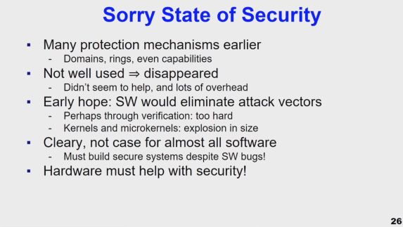 安全问题一直为人们关注,过去人们想到很多方法维持系统安全,但多数不好用或开销过大而逐渐被淘汰。早期人们发现提出了硬件抵抗攻击的方案,但其验证难度较大,且还面临着内核与微内核规模爆炸问题,这些方案逐渐被人们放弃。当前几乎所有的软件都必须构建安全系统,但仍存在软件缺陷,所以硬件必须对安全领域有所作为。