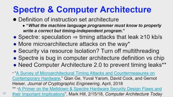 怎样才能使机器语言程序员写出正确的,且没有时间依赖性的程序?现在的体系结构面临着大量的“幽灵”猜测(时序攻击,大于10kb/s),将来也会有更多的微架构式攻击,我们是通过资源隔离还是关闭多线程以保证安全?这需要新的体系架构具备防止时序泄露的能力。