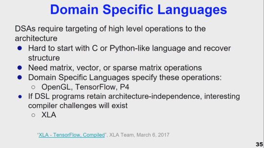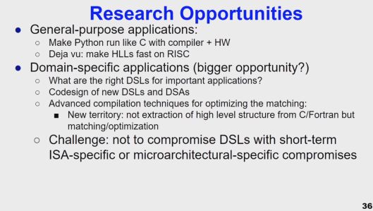 领域专用语言如OpenGL,TensorFlow等可对专用架构所需的常用操作进行总结,如矩阵、向量或稀疏向量的操作。然而,如果领域专用语言(DSL)程序与专用架构保持独立性,将导致编译上的困难。因此,针对通用应用任务,可以利用高级语言及其编译器实现在通用架构(如RISC)执行,而针对领域专用应用任务,则实现领域专用软硬件协同设计并以高级编译技术进行优化与匹配。