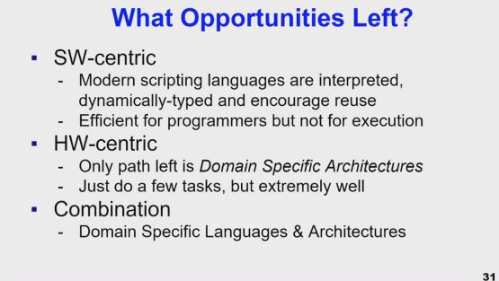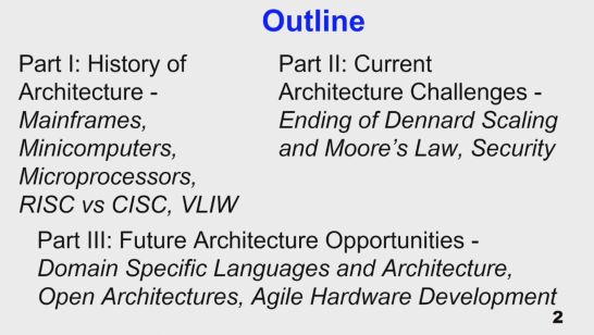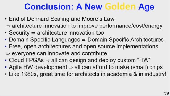 随着Dennard缩放定律与摩尔定律的终结,体系结构开始着重于提高性能,降低成本及功耗,计算机安全机制亟待革新,领域专用语言DSL催生了专用架构的产生,免费/开放的架构资源与开发套件,以及云FPGAs的开放使任何人都可定制硬件,硬件敏捷开发等诸多条件促成了体系结构的新黄金时代!