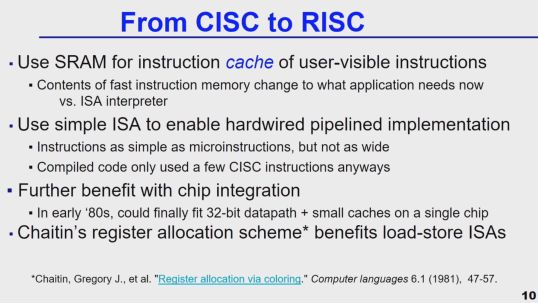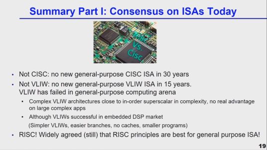 总结历史我们发现,CISC与VLIW分别在30和15年内未出现过新的通用ISA。尽管VLIWs在嵌入式DSP市场比较出色,但其在通用架构的竞技场中已败下阵来。如今在ISAs上我们达成了共识,RISC最终被大家认可是最普适的指令集!