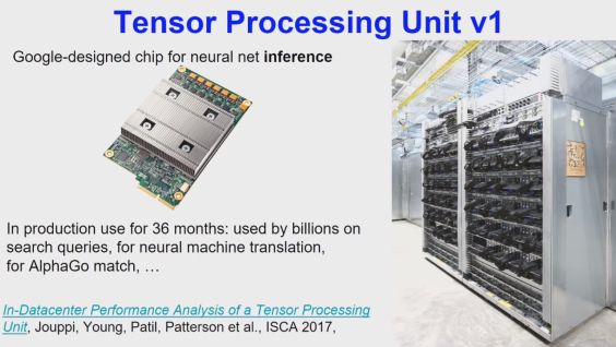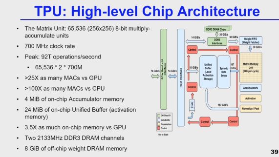 在机器学习领域,比较有代表性的专用架构中,Google设计的张量处理器(TPU v1,耗时36个月,数十亿),可用于神经网络运算、神经机器翻译、AlphaGo匹配等诸多任务,该专用处理器架构内部含有可完成65536(256x256)8bit规模乘累加单元的矩阵运算模块,4MB片上累加存储以及24MB单独缓存,其片上存储相比GPU多3.5倍,此外还包含了两个2GMHz左右的DDR3 DRAM通道,8GB片外DRAM存储,700M时钟频率,峰值操作可达到92T/s,其运算速率相比GPU快25倍以上,比CPU快100以上。