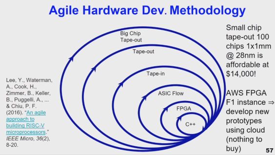 硬件敏捷设计,只需要很小的团队花较短的时间即可实现原型迭代。在敏捷硬件设计过程中,设计者可通过软件以高级语言对开发者的创新架构进行描述与仿真;然而所设计的模型在软件中并不能运行数十亿或更多的周期,开发者需借助FPGA工具进行验证,云FPGA的开放,使开发者无需购买验证硬件即可实现FPGA验证。经过前述步骤的迭代过程,即可准备流片,由于摩尔定律迟缓,当前的流片成本也逐渐降低,减轻了团队流片的成本压力。这种敏捷开发在伯克利试验过,一个团队在短短5年时间里即可制造10次芯片,使团队积累了丰富的芯片设计经验。