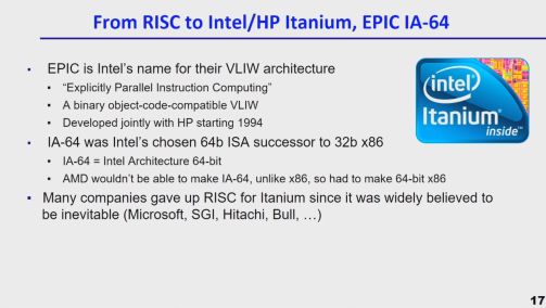 Intel自1994年起与惠普联合开发了一种针对Intel IA-64架构的纯64位微处理器Itanium /Itanium 2,其指令集是EPIC(二进制对象代码兼容的VLIW指令集),具有明确的并行指令计算,当时被认为是一个趋势,很多企业(包括Microsoft, SGI, Hitachi, Bull, …)也尝试放弃RISC而转向Itanium。