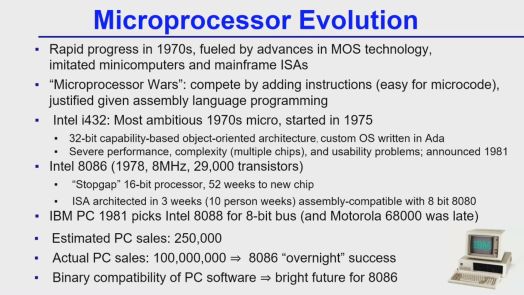由于半导体技术推动,微程序设计在70年代发展迅速,期间出现了经典的Intel i432、8086以及8088处理器。8086采用16比特架构,可兼容8bit处理器8080。在8080后,Intel还研发过i432处理器,当时(1975)被认为是最具雄心的微处理器,它抛弃了继承x86的技术路线,基于32位功能,面向对象架构,拥有以Ada编写的自定义操作系统,然而该处理器存在一些性能、复杂性以及可用性上的问题,商业上失败告终。IBM在1981在其个人计算机(PC)采用了Intel 8088处理器,尽管该PC出色的销量导致了Intel 8086 “一夜成名”,但PC软件的兼容性也使得8086系列看清了未来发展方向。