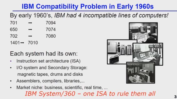 20世纪60年代早期,IBM的4种系列机型,每种都有独立的指令集架构、I/O二级存储系统、组装、编译器等,尽管这些机型在商业、科学、实时领域的市场均不错,但却遇到了严重的机型不兼容问题,这意味着公司需针对各系列的机型均投入相当大的成本。因此,IBM决定统一所有机型的指令集。