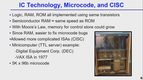 由于逻辑运算、RAM与ROM均以晶体管实现,半导体RAM与ROM具有类似的速度,摩尔定律以及RAM对微程序的重写能力,促使了复杂指令集(CISC)的诞生。同时,微程序设计在学术界非常流行,最著名的可写控制存储计算机是1973年由Chuck Thacker(2009年图灵奖获得者)领导设计的Xerox Alto,Xerox Alto是第一台现代个人计算机,首次使用了图形用户界面以及具有以太网功能,其像素转换与以太网控制器采用了微编码技术。