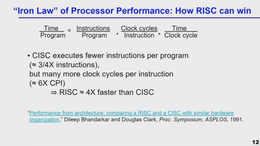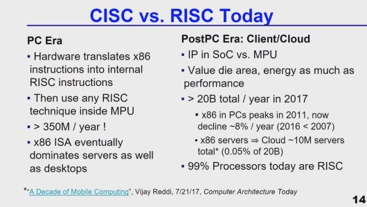 早在1991年,研究者证明,尽管CISC在运行中执行较少的指令,但其指令的平均执行周期较长,而RISC则在相同的硬件配置下比CISC的执行速度快4倍。在随后的PC 时代,许多硬件将x86指令转换为内部RISC指令,在MPU内使用RISC技术,这一策略使得x86指令集继续主导了服务器与PC领域,然而,后PC时代直到现在,已超过99%的处理器均使用RISC,其中大部分要归功于ARM。