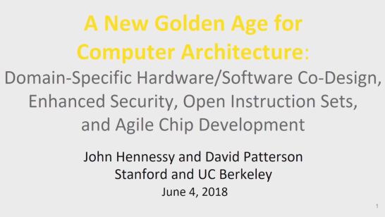 6月4日,在今年的国际计算机体系结构大会ISCA2018的图灵奖演讲会上,ACM/IEEE邀请了2017年图灵奖获得者John Hennessy与David Patterson联合进行了一场关于未来计算机体系结构发展道路探索的精彩演讲。二位图灵奖得主介绍了在Dennard缩放定律与摩尔定律逐渐终结过程中,计算机安全需求、领域专用语言、开源硬件、硬件敏捷开发等诸多新技术,展望了体系结构迎来了新黄金时代。