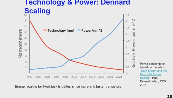 能耗成为架构设计的关键约束条件。Dennard缩放定律表示:晶体管面积的缩小使得其所消耗的电压以及电流会以差不多相同的比例缩小。但在晶体管越来越小时,量子隧穿效应开始介入,晶体管开始出现漏电现象,使得晶体管在更小的工艺时静态功耗反而增大,这导致了Dennard缩放定律终结。