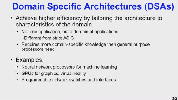 专用架构的设计:将硬件架构进行定制并使其具备特定领域应用特征,使该领域的一系列应用任务都能高效执行。相比通用架构,专用架构的设计需要设计者对专用领域知识更加了解。当前比较流行的专用架构包括:机器学习领域的神经网络处理器,图形图像、虚拟现实领域的图像处理器(GPUs),可编程网络交换机及接口等。