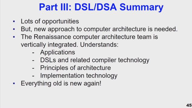 机会有很多!但体系结构设计也需要新方法,我们需要重新垂直组建计算机架构团队,他们需要掌握包括应用、DLSs以及相关编译技术、体系结构原理、技术实现等。John总结到:“Everything old is new again!”过去旧的技术重新变成新的了!