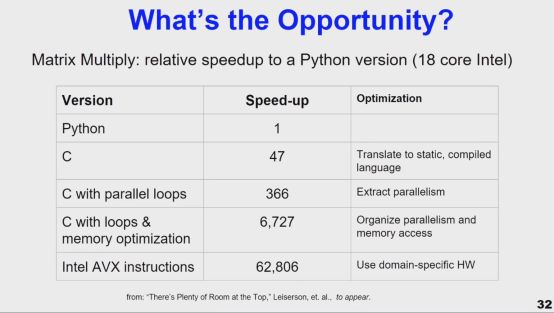 以软件为中心的方法尽管在编程方面比较方便,但在执行上非常低效;而以硬件为中心的方法只剩下了专用架构,尽管只能完成少量的任务,但执行非常高效!因此,专用软硬件协同设计将成为不二之选。假定以Python执行矩阵乘法运行速度为1,通过专用硬件的加速比可达到62806,可见专用加速架构存在巨大的机遇。