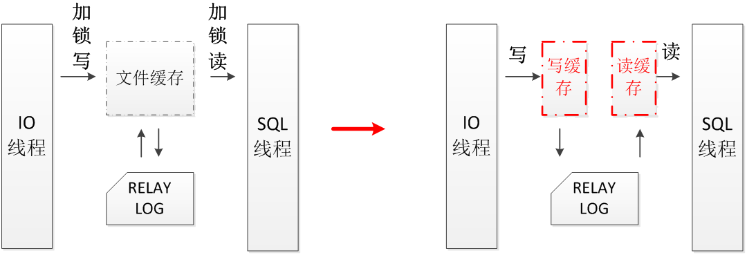 将IO线程和SQL线程对relay log的操作拆分开来,不再使用同一块文件缓存。虽然这样做会导致SQL线程增加一次读IO操作。但是消除了对锁的竞争,大大地提高了IO线程和SQL线程整体的性能。