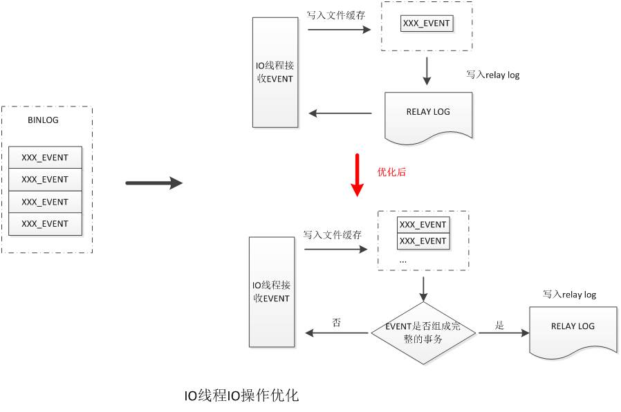 全部event组成一个完整的事务,完整的事务才会被SQL线程正确复现到从库上。当前IO线程接收binlog时,是以event为单位进行接收,即接收到一个event,记录到relay log中后再继续接收下一个。这种做法是低效的,也没有充分利用到MySQL本身的文件缓存。