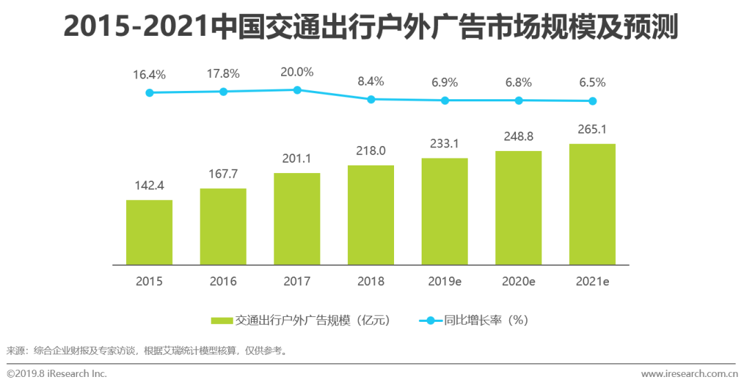 根据艾瑞咨询数据显示,2018年中国交通出行场景户外广告市场规模达218亿元,同比增长率为8.4%,随着机场、铁路、公交和城轨等交通网络的不断扩展,交通出行场景的户外广告规模也将维持着较为稳定的增速同步发展,预计市场规模将于2021年达到265.1亿元。