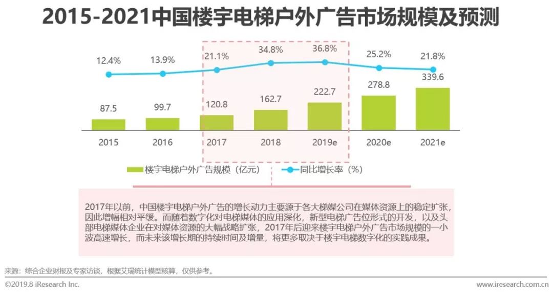根据艾瑞咨询数据显示,2018年中国楼宇电梯户外广告市场规模达162.7亿元,同比增长率为34.8%,未来楼宇电梯户外广告的发展势头依然强劲,预计2021年市场规模将达339.6亿元。