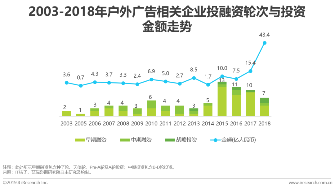 由近年投资方对户外广告相关企业的投资趋势得出,获得早期轮次投资的公司增多,战略投资方也从2013年起开始将眼光投向户外广告市场,并且,资金逐步向经营电梯场景的户外媒体公司和户外广告投放平台等数字户外公司方向集中。这是由于近年来数字户外兴起,除了科技巨头带头搭建数字化户外广告平台外,市场上也开始涌现出不少具有创新意识和发展潜质的数字化户外广告公司,吸引了资金的投入。另外,电梯是目前户外各场景中发展稳定且势头强劲的场景,也是投资方敢于投入大额资金的对象,尽管新兴细分场景不断在被开发,目前暂未出现势头能超越电梯的新场景。资金的追逐和支持进一步带动了数字化户外的发展和电梯场景户外媒体公司的壮大。