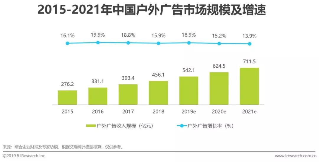 在中国的各类广告中,户外广告的历史最为悠久,自古至今经历过朝代更迭、时代转换,却历久弥新。 这得益于不论生活场景、消费者需求和触媒习惯如何转变,户外广告总能因地制宜地得以展示并延伸进生活的每一面。 除开户外广告自身特性,来自需求端、供给端和例如城镇化推进、消费支出增多等宏观因素的驱动力也时刻影响、推动着户外广告的发展。 在未来,户外广告的增长率将持续提升,预计在2021年将拥有711.5亿元的规模,成为线下广告中愈加重要的广告市场。