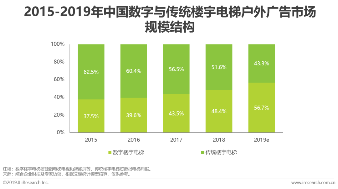 艾瑞分析认为,中国楼宇电梯户外广告市场仍然有较大增量空间,主要原因有四: 1)楼宇新建率的稳定上升; 2)楼宇电梯商业化渗透率的不断提高,尤其是三线及以下城市所属的下沉市场; 3)电梯空间中近年新开发广告位类型的普及和完善,在场所供应数量不变的情况下增加广告资源位; 4)数字技术应用深化,提高广告承载量和利润空间,预计2019年楼宇电梯数字广告市场规模将首次超过传统楼宇电梯广告,而这也是楼宇电梯户外市场当前乃至未来发展最重要的推动力。