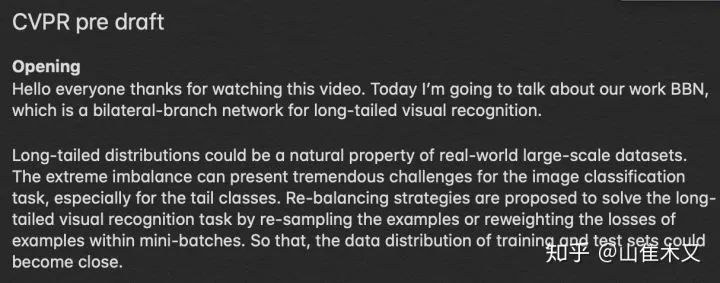 写好一份精炼的讲稿,由于正常情况下人一分钟能说130~150词,所以讲稿的长度完全由视频要求的时长决定,由于CVPR视频限时5分钟,我写的就是700词左右的讲稿;