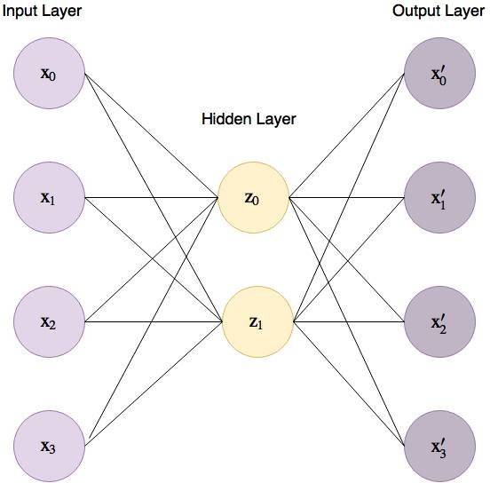 自编码器始于一些随机的低维表征(z)并会通过梯度下降改变其输入层和隐藏层以及隐藏层和输出层之间连接的权重,从而找到它们的解。