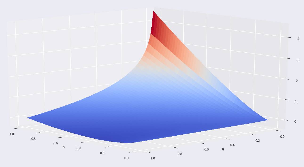 让我们看看这会对我们的成本函数(被称为 KL 散度(Kullback–Leibler divergence))带来怎样的影响。让我们绘图,然后看看没有求和部分的公式 (3)。