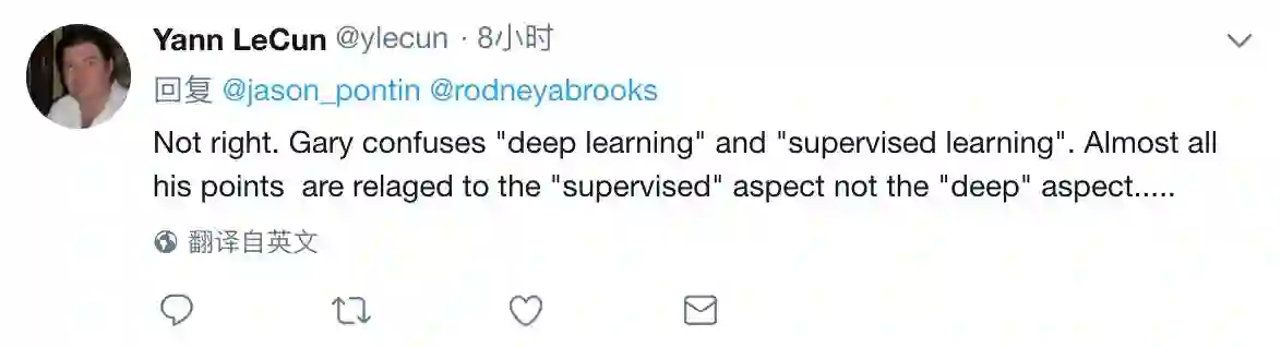 当然不只是简单质疑,推文下观战的各位也不安分的呼喊LeCun说出更多质疑理由,LeCun在之后又发推叙述了自己的观点:“不正确,Gary混淆了‘深度学习’和‘监督学习’。”