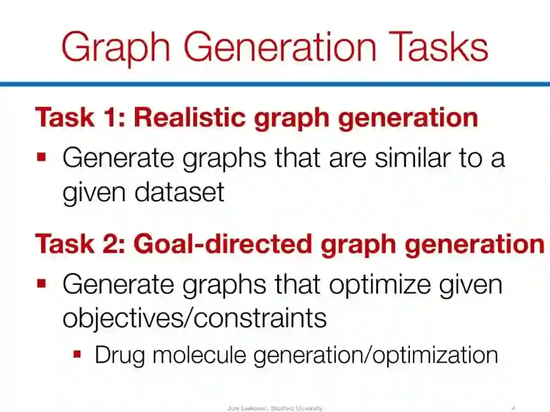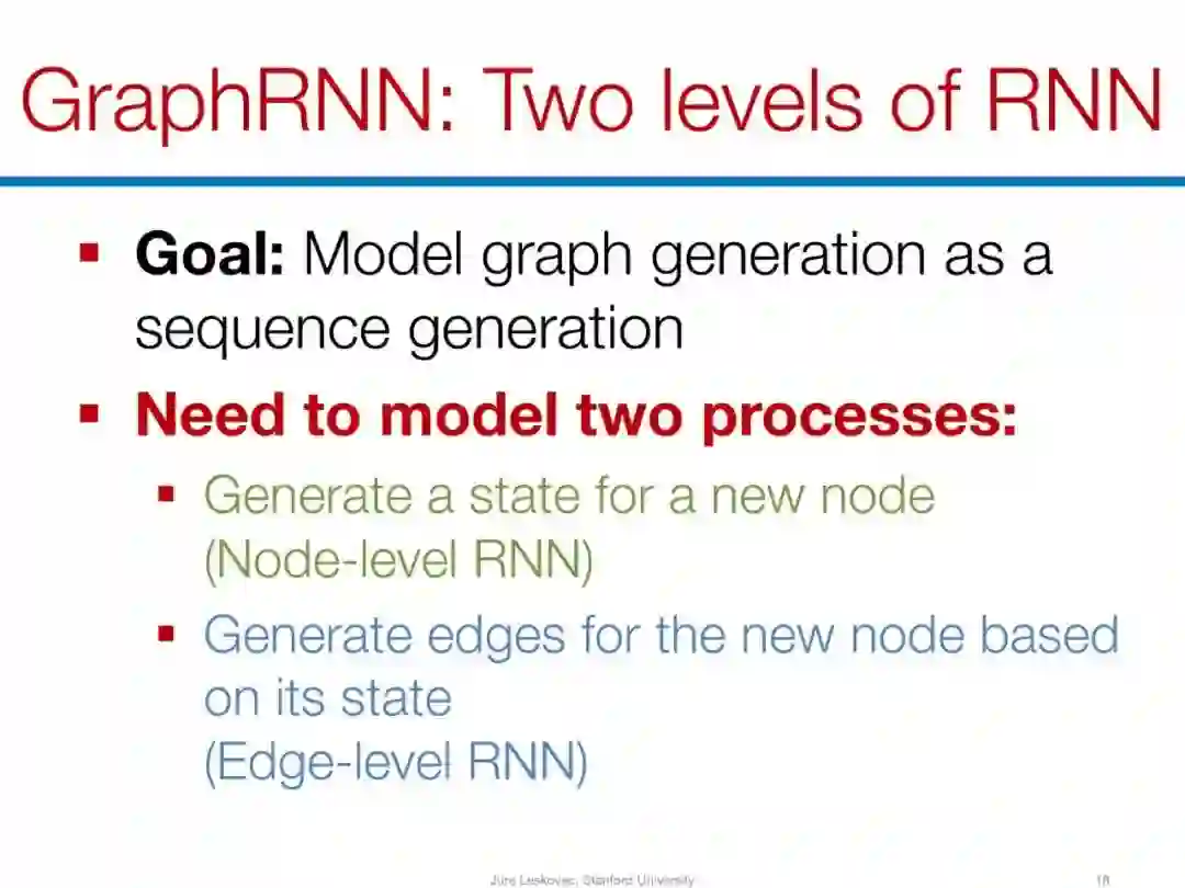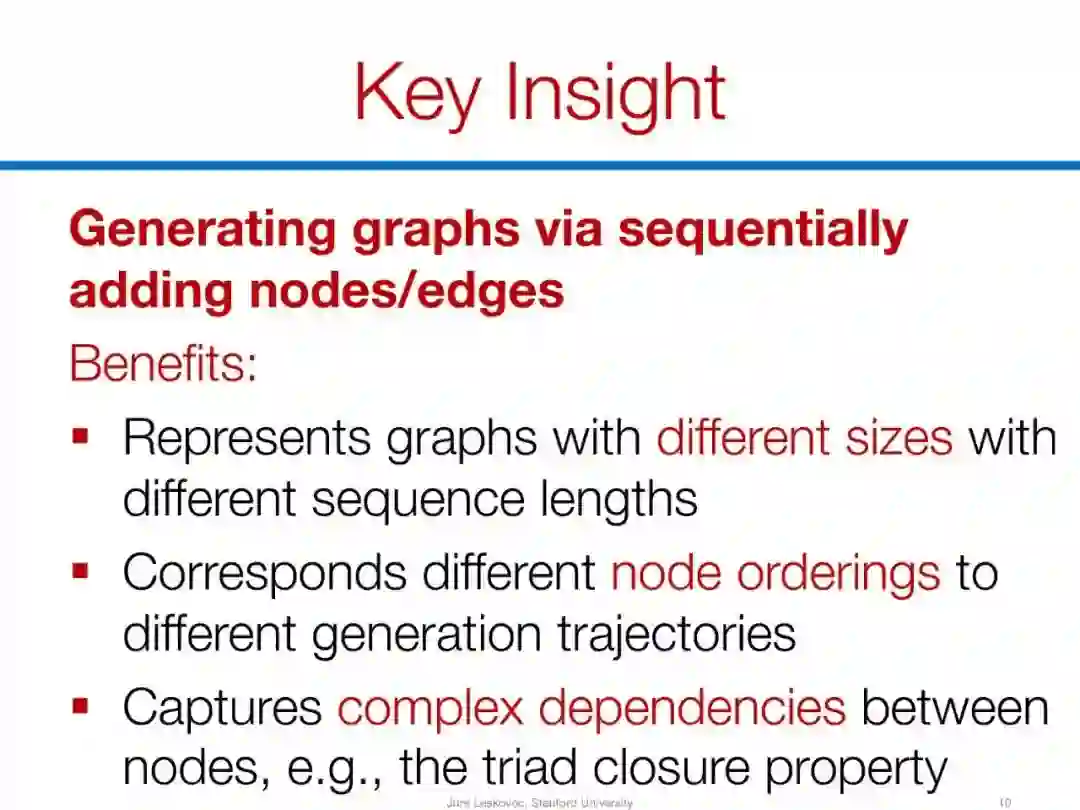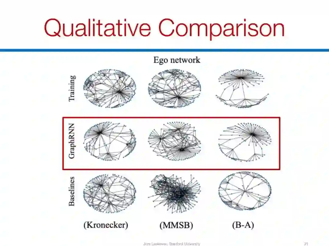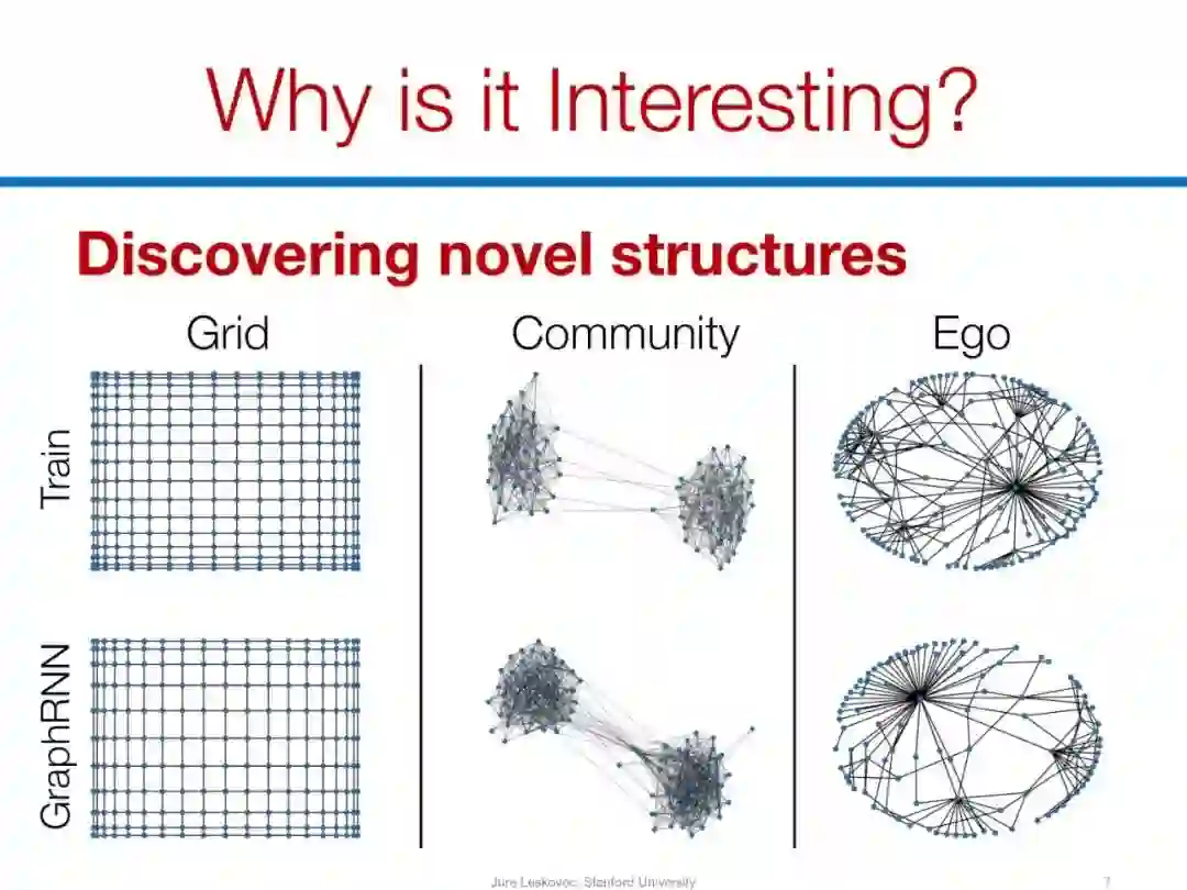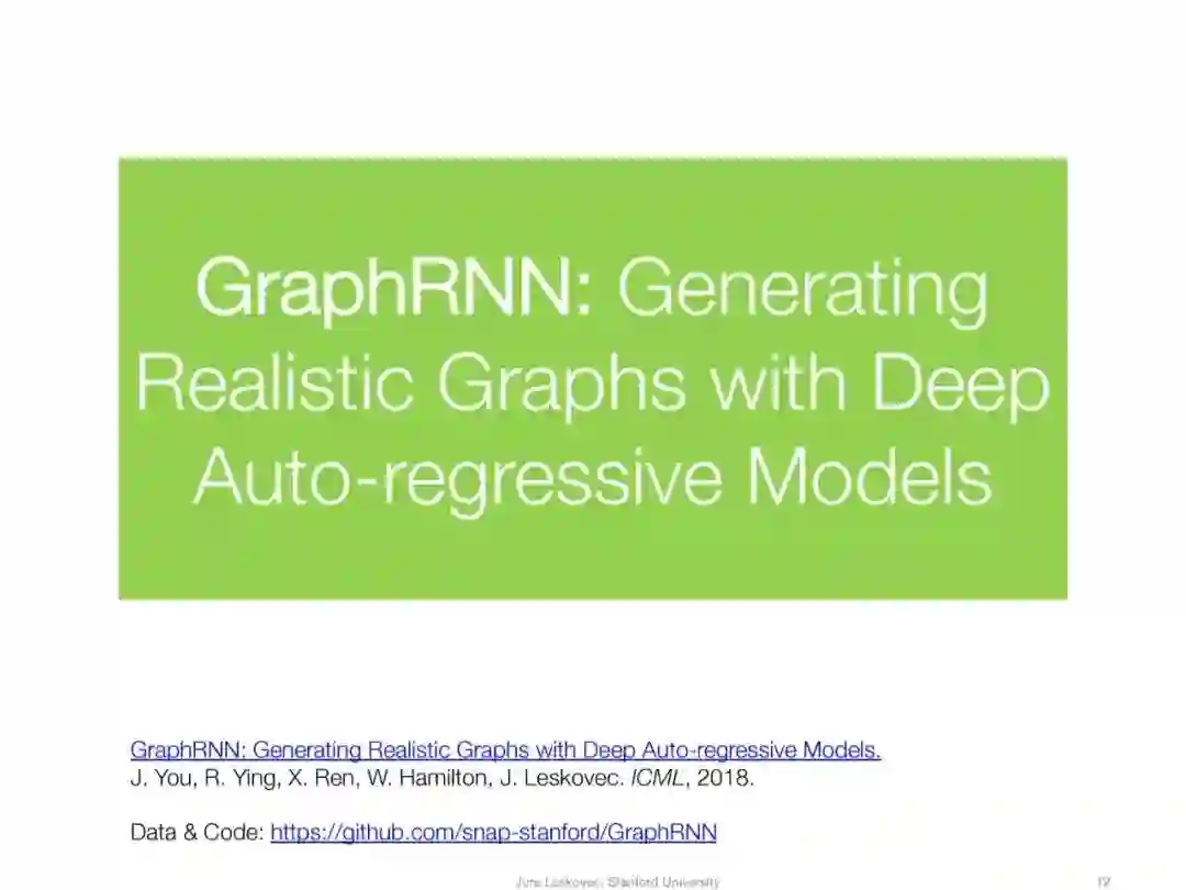 此外,在 ICLR 受邀演讲上,Jure Leskovec 教授还就图深度生成模型做了演讲。在这次演讲中,Jure 阐述了图生成模型的方法和应用,并详细介绍了他的最新成果,GraphRNN 和 Graph Convolutional Policy Network。