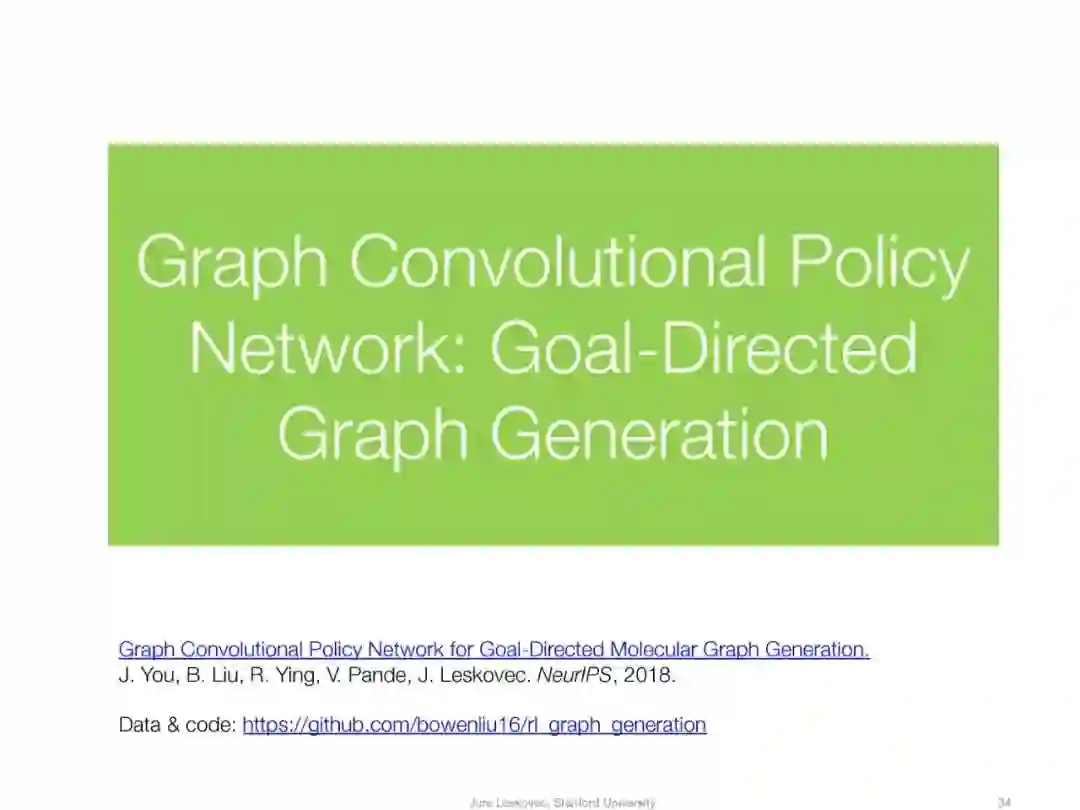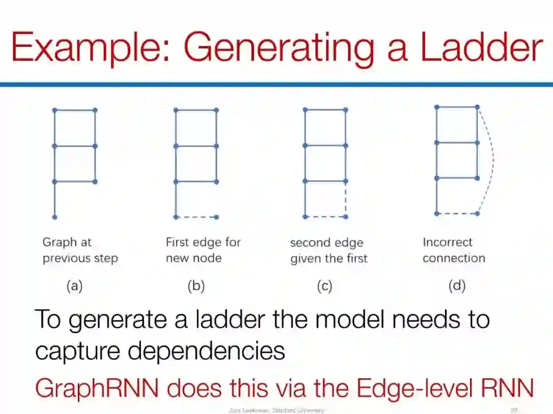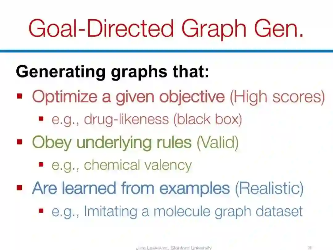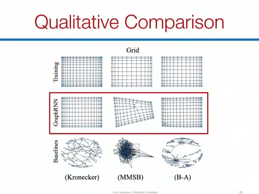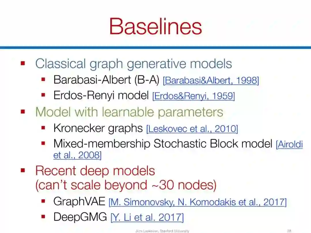 此外,在 ICLR 受邀演讲上,Jure Leskovec 教授还就图深度生成模型做了演讲。在这次演讲中,Jure 阐述了图生成模型的方法和应用,并详细介绍了他的最新成果,GraphRNN 和 Graph Convolutional Policy Network。