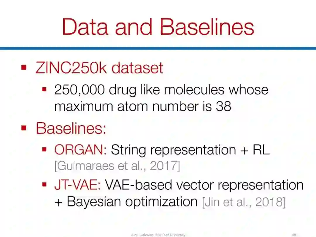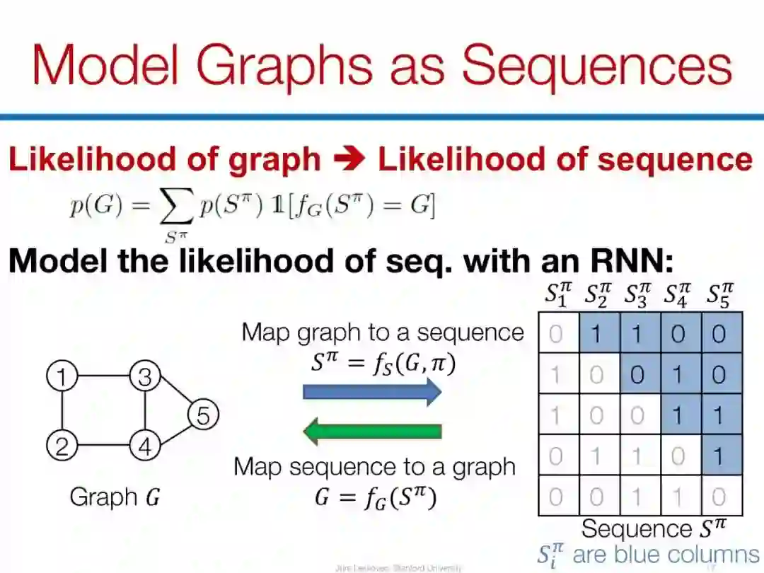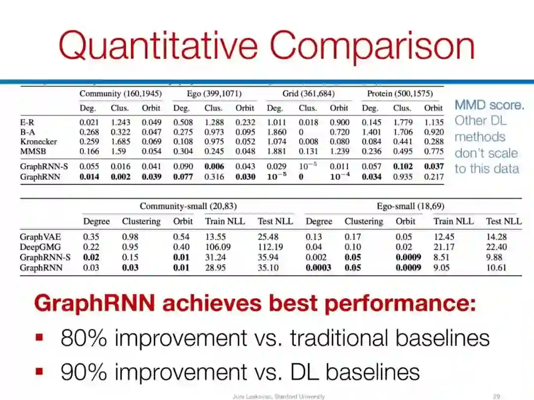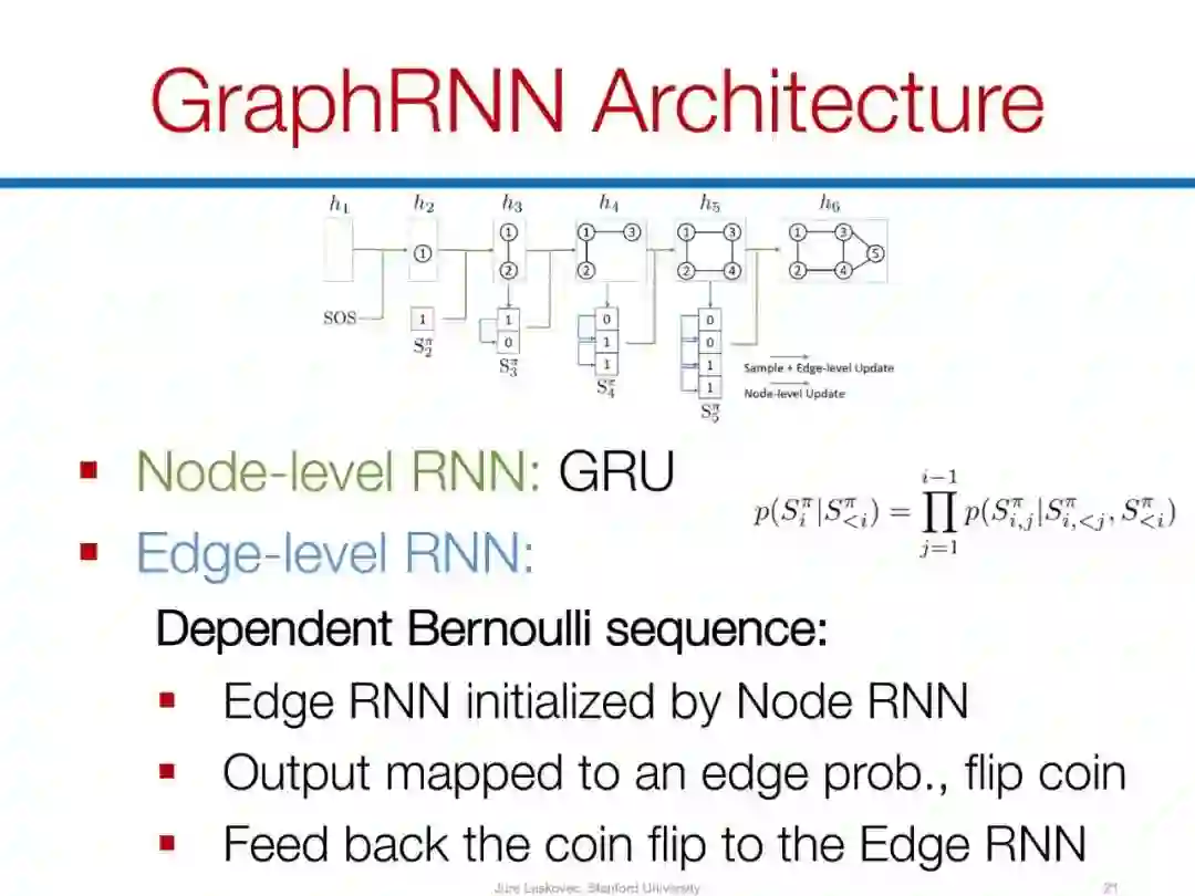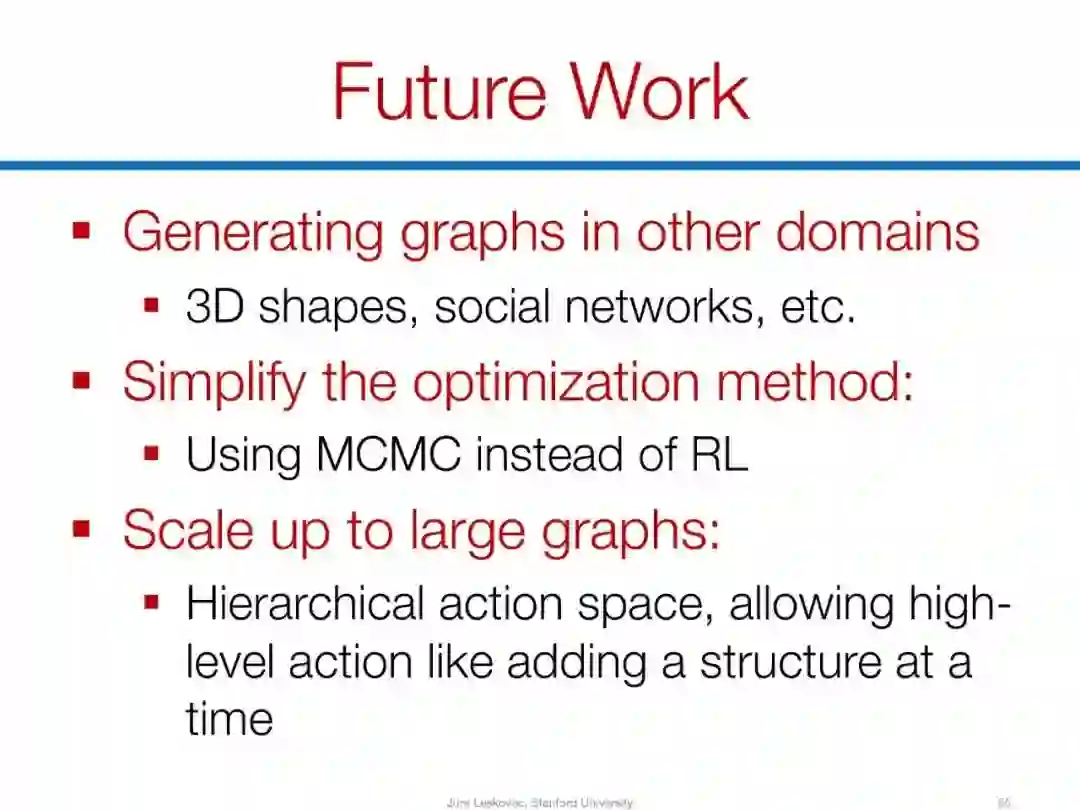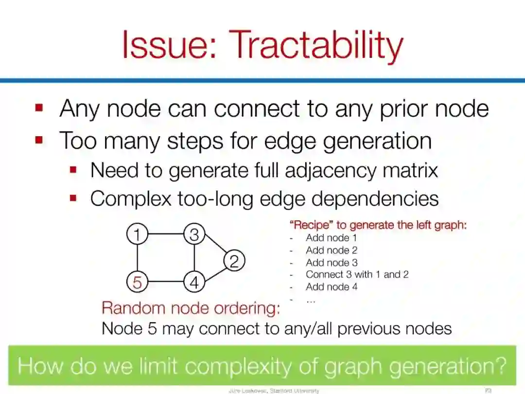 此外,在 ICLR 受邀演讲上,Jure Leskovec 教授还就图深度生成模型做了演讲。在这次演讲中,Jure 阐述了图生成模型的方法和应用,并详细介绍了他的最新成果,GraphRNN 和 Graph Convolutional Policy Network。