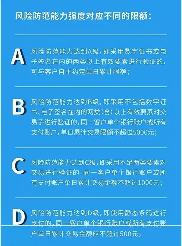 李子川补充道:超过500元的动态条码支付,A级一般要求有数字证书以及电子签名等要素验证方式;B级要求除数字证书和电子签名这两种方式以外,至少含有两类以上的其他要素方式,不同的级别要求程度不同。而静态码支付500元的限额没有要素验证,它是指用户单个银行账户或者所有支付账户累积的限额。