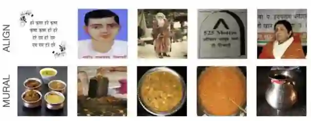 我们还分析了 WIT 数据集 上的零样本检索实例,比较了 ALIGN 和 MURAL 对英语(en)和印地语(hi)的检索。MURAL 比 ALIGN 具有更好的检索性能,反映了对文本语义的较好把握,如印地语等资源不足的语言。