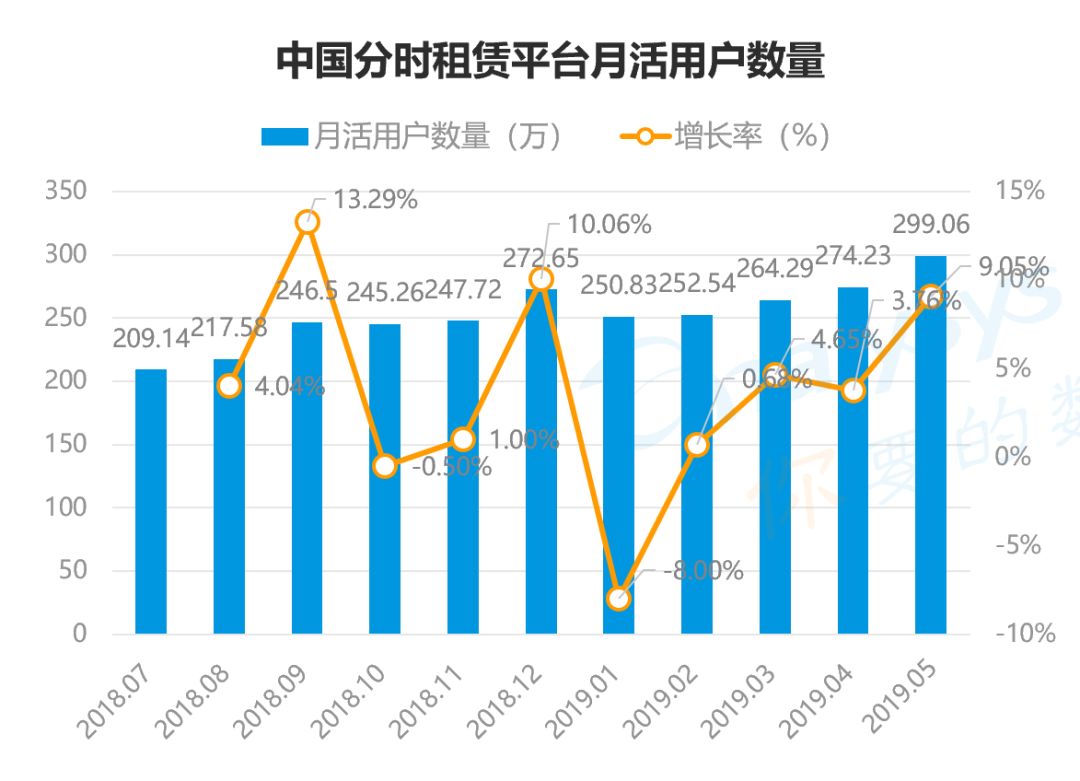 据易观研究显示,分时租赁平台的月活用户增长率已经从2019年初的-8%增长至5月份的9%,用户平均使用时长也有所提升,分时租赁平台正在度过此前押金和平台整合的负面影响。