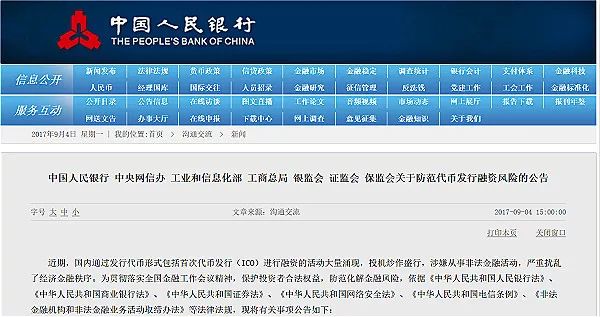 2017年9月4日,中国央行等七部委发布关于防范代币发行(ICO)融资风险公告,认定ICO及其代币为非法集资和传销骗局