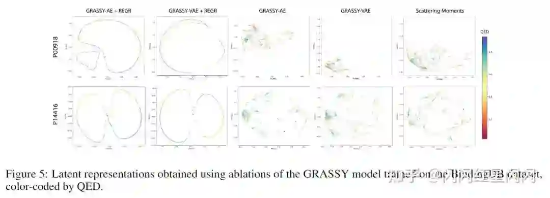 上图显示了在 GRASSY 上训练时,每个数据集的潜在空间表示。其中,潜在空间由四个不同的属性着色,每个属性都是潜在空间回归任务的一部分。