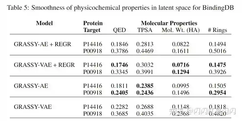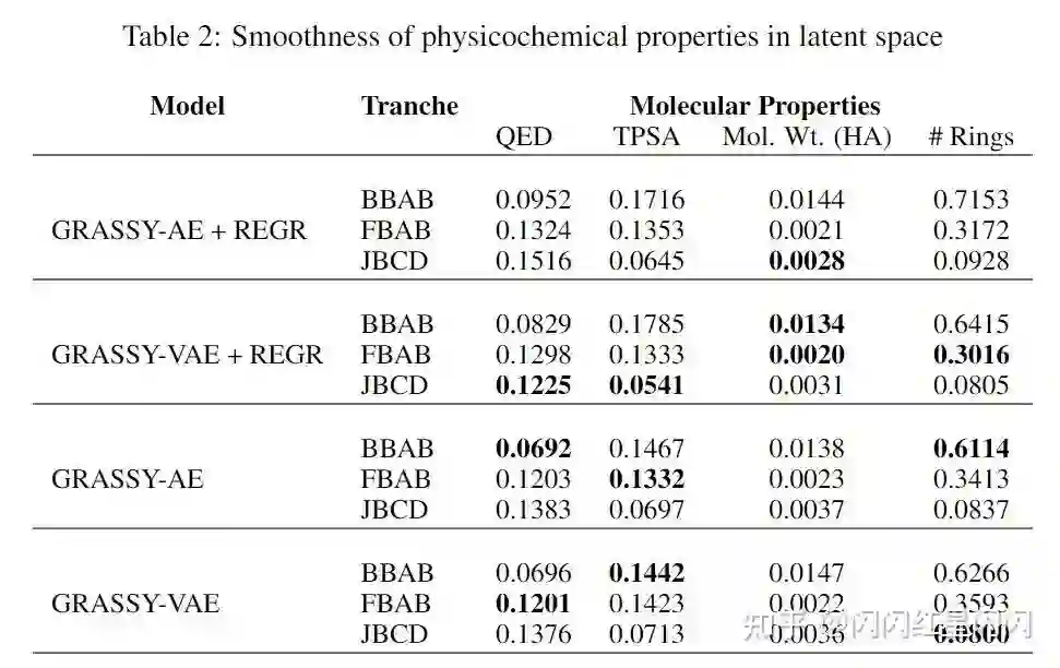 上面两张表分别显示了在不同数据集上,所提出模型在潜在空间中的物理化学性质的平滑度。