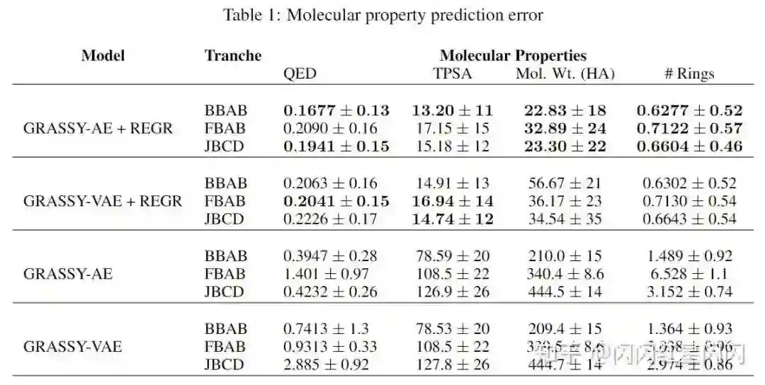 上表显示了在 ZINC 数据集的不同分支中,四种不同物理化学性质的模型在分子性质预测上的误差。