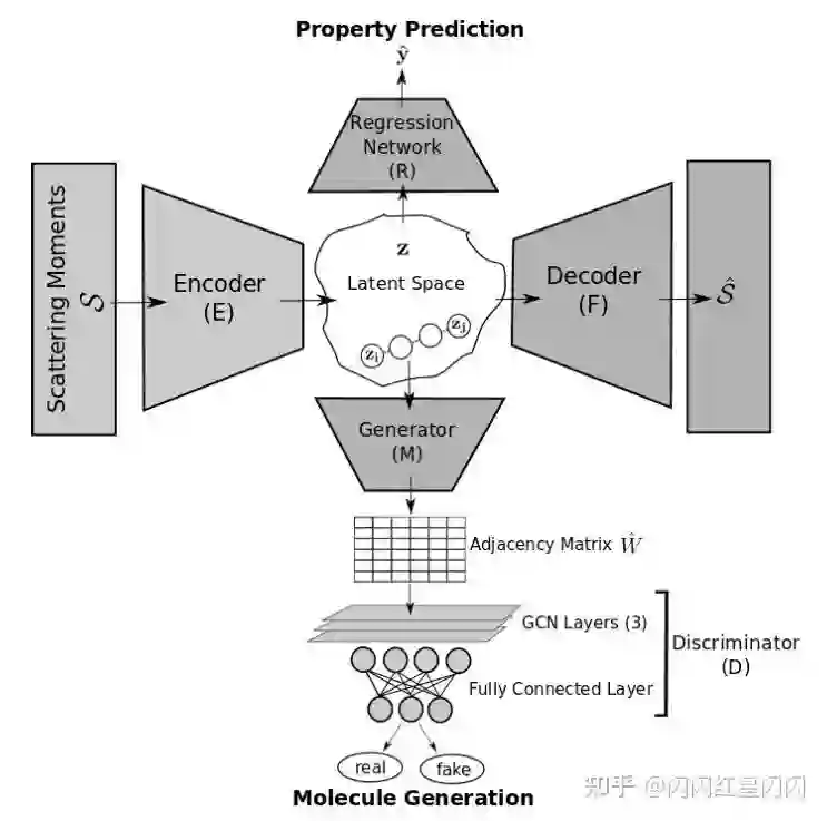 整体概述,包括1)在输入图上计算的几何散射动量(scattering moments),传递给2)编码器网络,其潜在空间被属性预测和图形生成任务所正则化,并通过3)解码器进行了重建训练,4)用GAN和插值损失训练的分子生成网络。