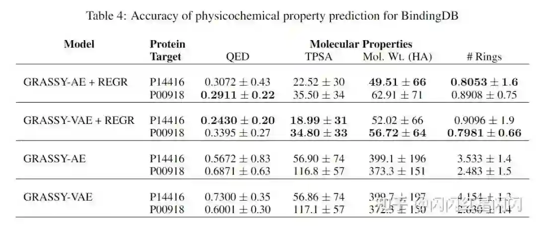 最终,作者在 ZINC (类药分子的数据集,每个分子都有几个属性) 和 BindingDB (一个药物-靶相互作用的数据库) 两个数据集上证明了 GRASSY 的实用性。作者发现 Grassy 学习了几段 ZINC 的潜在空间,并生成了类药分子。作者还表明,GRASSY 可以学习与特定目标具有结合亲和力的分子,并在这个空间中生成分子。