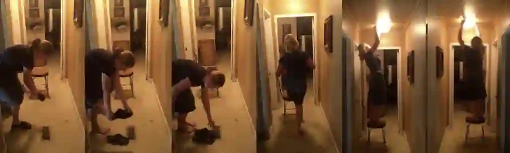 Caption: A woman standing in a hallway takes off her slippers. Shethen climbs on a chair and starts doing something with the ceiling light.