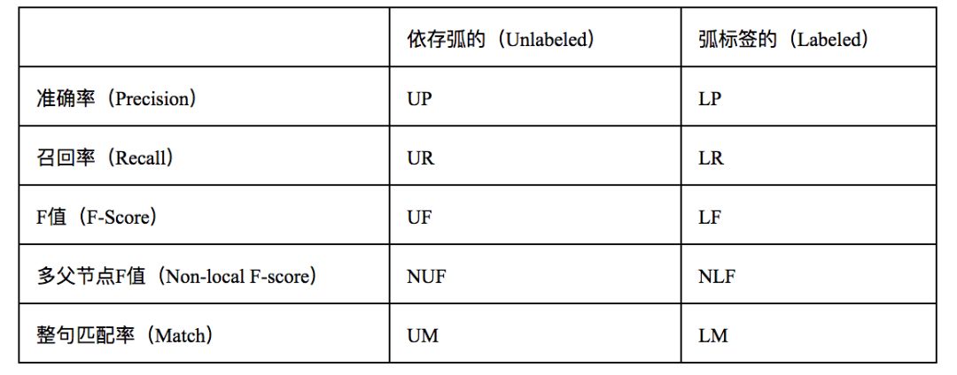 SemEval-2016 Task 9评测的评测指标如表2所示,其中最重要的两项是LF和NLF,分别代表了整体的弧标签F值和多父节点词的弧标签F值,其中后者对于图结构分析尤为重要,因为只有图结构中才允许多父节点词的出现。评测最终以LF值作为系统排名依据。