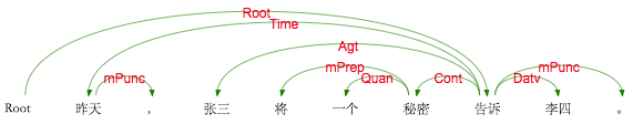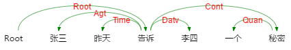 语义依存分析是通往语义深层理解的一条蹊径,它通过在句子结构中分析实词间的语义关系(这种关系是一种事实上或逻辑上的关系,且只有当词语进入到句子时才会存在)来回答句子中“谁在何时对谁做了什么”等问题。例如句子“张三昨天告诉李四一个秘密”,语义依存分析可以回答四个问题,即谁告诉了李四一个秘密,张三告诉谁一个秘密,张三什么时候告诉李四一个秘密,张三告诉李四什么。