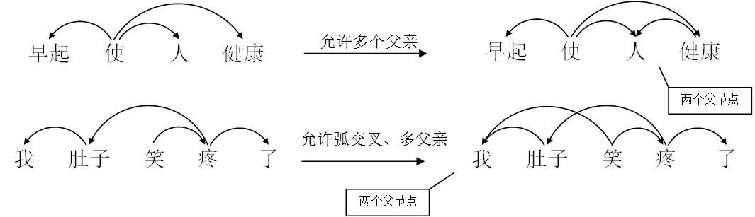 我中心于2016年与北京语言大学邵艳秋教授合作在SemEval-2012 Task 5中文语义依存树数据集的基础上针对其语义关系彼此易混淆、语义关系数量太大,有些关系在标注语料中出现次数很少;依存树结构,刻画语义不全面等问题,扩展了语义依存的表示形式,提出了中文语义依存图,在必要时突破树形结构。这样的突破使得对连动、兼语、概念转位等汉语中常见的现象的分析更全面深入,当然这也给依存分析器的构建带来了很大的难度,因为任何词都可能有多个父节点。图3直观地展示了语义依存树与依存图的区别。