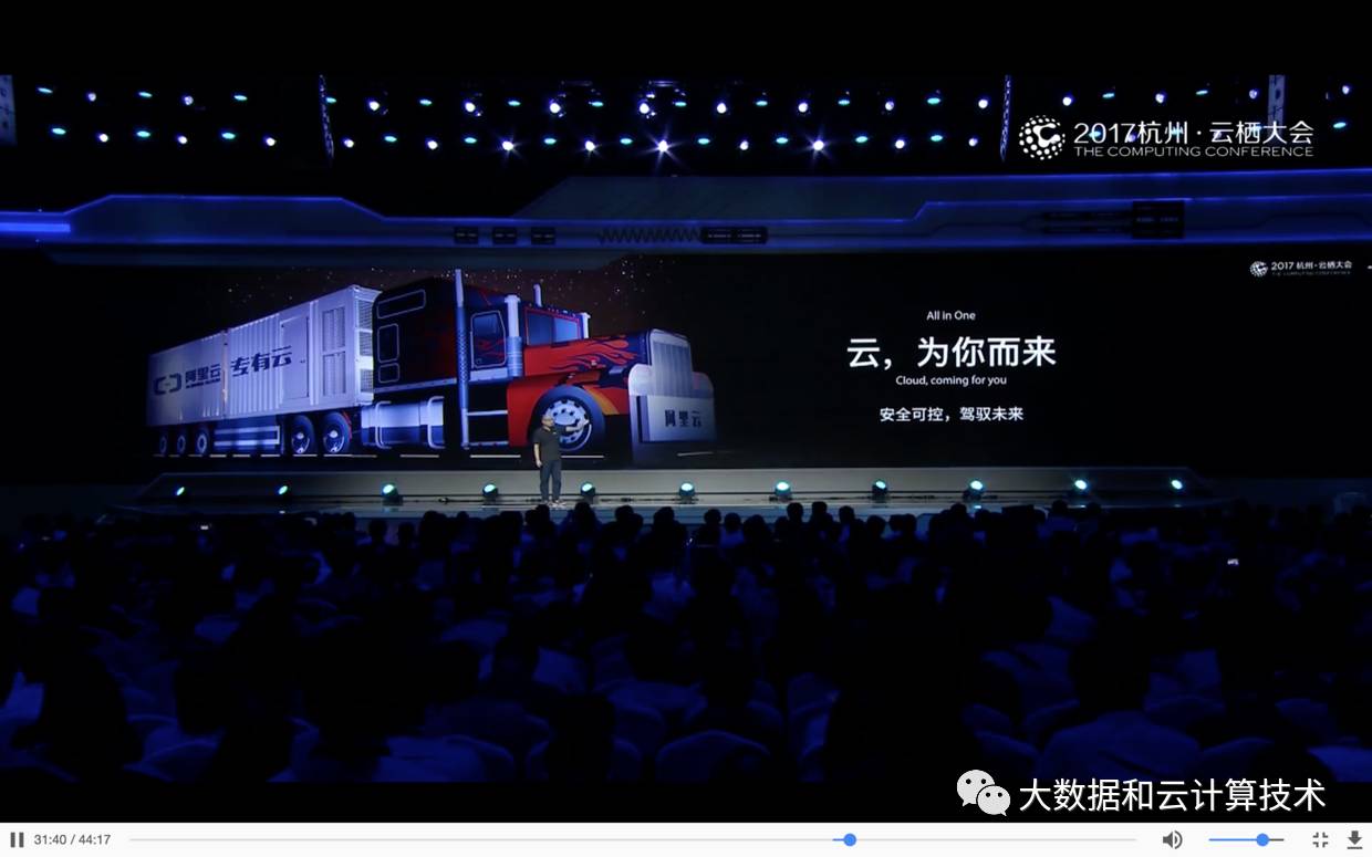 下面这个大卡车就是阿里2017在杭州的云栖大会发布的专有云。这个卡车号称最大能力可以处理500万TPS业务。
