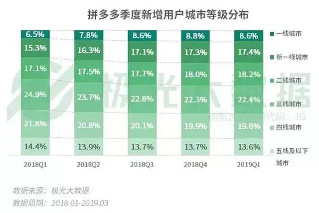 在2019年第一季度,拼多多新增用户中,有44.2%来自于二线及以上城市。